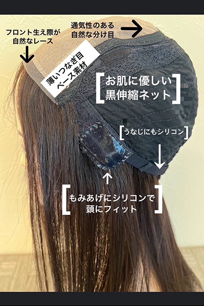 滑り止めシリコンを付けることでウィッグの固定力がアップ。